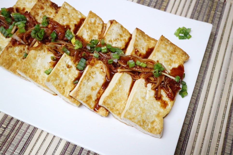 5. 두부가 전체적으로 노릇하게 잘 구워지면 접시에 담아 양념장을 곁들여 완성한다.