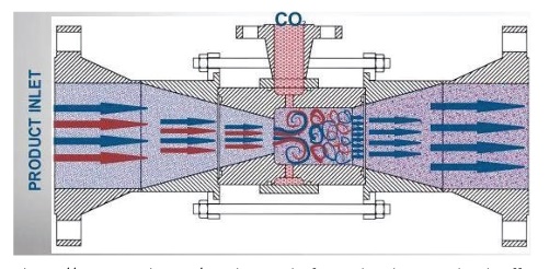 베르누이의 원리에 따라 파이프의 좁은 영역에서의 유속 증가하겠죠. 그 때 제트 노즐을 통해 CO2가 유입됩니다. 파이프의 쐐기형 영역에서 난류 흐름에 의해 혼합이 잘됩니다.