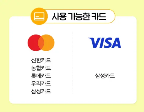 삼성페이 해외 결제 가능한 카드는 마스타카드를 지원하는 삼성카드, 우리카드, 롯데카드, NH농협카드 그리고 비자(VISA)를 지원하는 삼성카드만 사용할 수 있다.