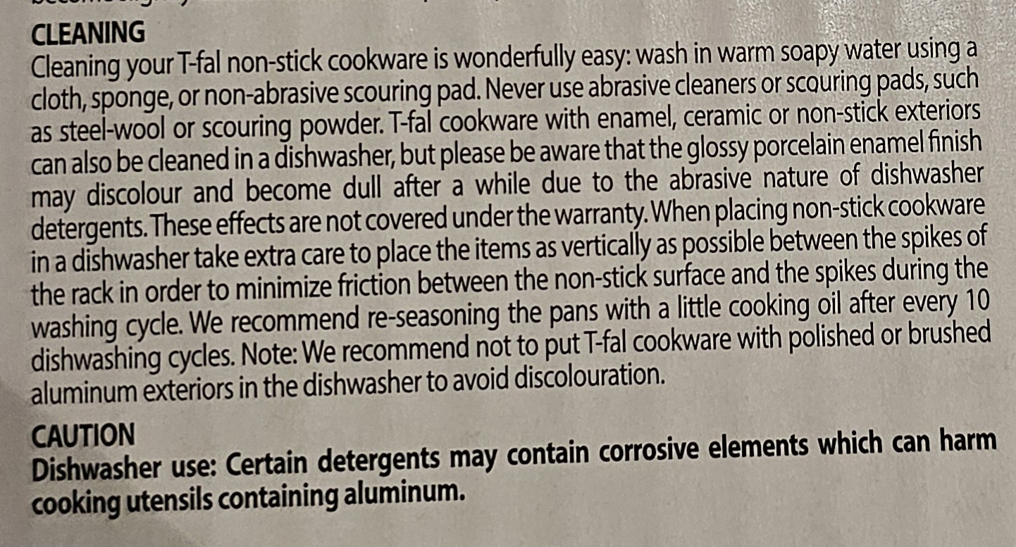 에나멜, 세라믹 또는 비점착성 외장 처리된 T-fal 조리기구도 식기세척기로 세척할 수 있지만, 유광의 도자기 에나멜 마감 처리는 세척제의 마모성 특성 때문에 시간이 지나면서 색이 변하거나 광택이 사라질 수 있다는 점을 유의하세요.